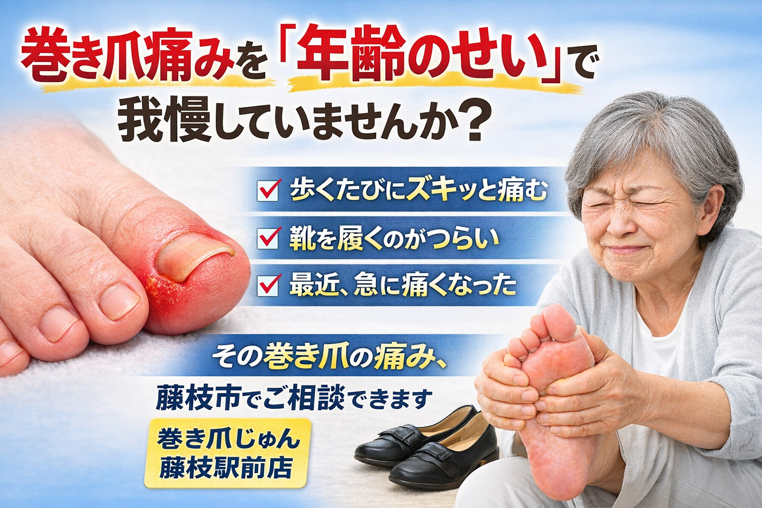 藤枝市で巻き爪のご相談を受けていると、「もう年齢のせいだから仕方ないですよね」「昔より爪が硬くなったから痛いんだと思います」と言われることがよくあります。確かに、年齢を重ねることで爪は厚くなり、巻き爪になりやすくなる傾向はあります。しかし、藤枝駅前店に来院される方の多くは、年齢よりも「今の痛みをどうにかしたい」という切実な悩みを抱えています。実際にお話を伺うと、「昨日から急に痛くなった」「歩くたびにズキッとする」「靴を履くだけでつらい」といった声が非常に多く、年齢だけが原因とは言い切れないケースばかりです。