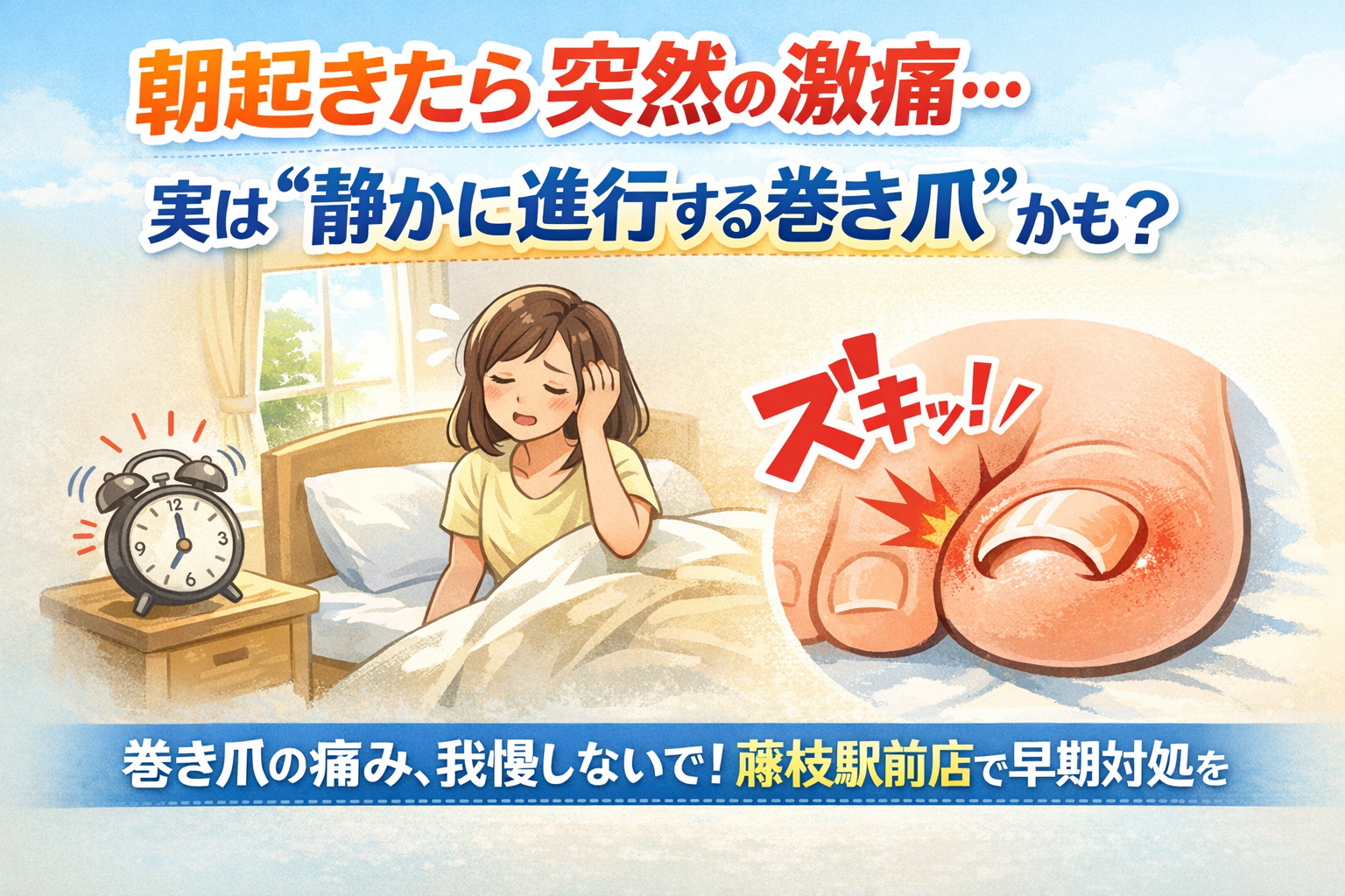 昨日まで平気だったのに、突然強くなる巻き爪の痛み。その原因と放置のリスクを、藤枝駅前店の視点でわかりやすく解説します。なぜ急に悪化するのか、自然に改善しない理由とは。本気で巻き爪を改善したい方、今まさに痛みで困っている方は必見です。