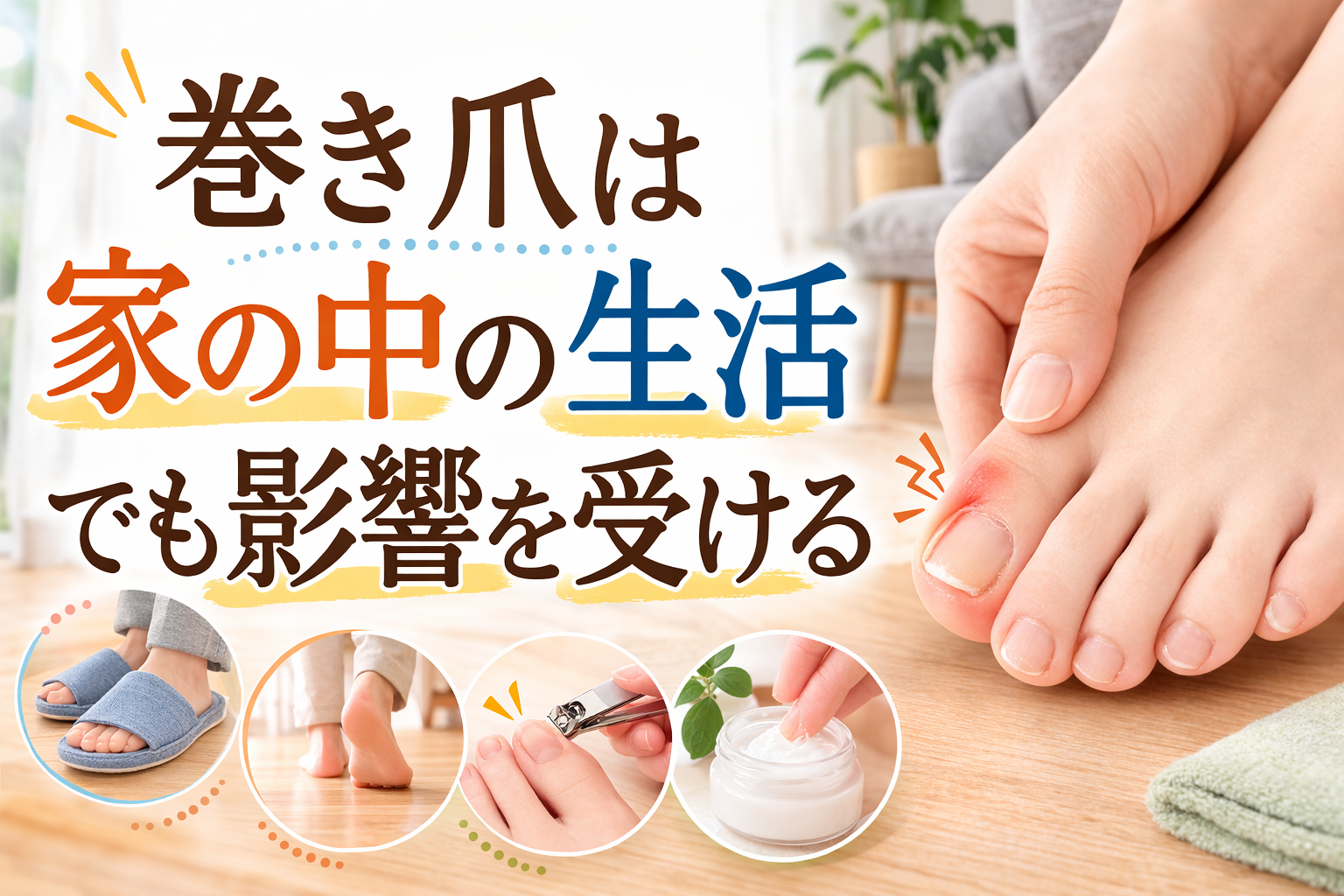 巻き爪というと、きつい靴や長時間の歩行など外での生活が原因だと思われる方が多いかもしれません。しかし実際には、家の中での生活習慣が巻き爪の状態に影響していることも少なくありません。