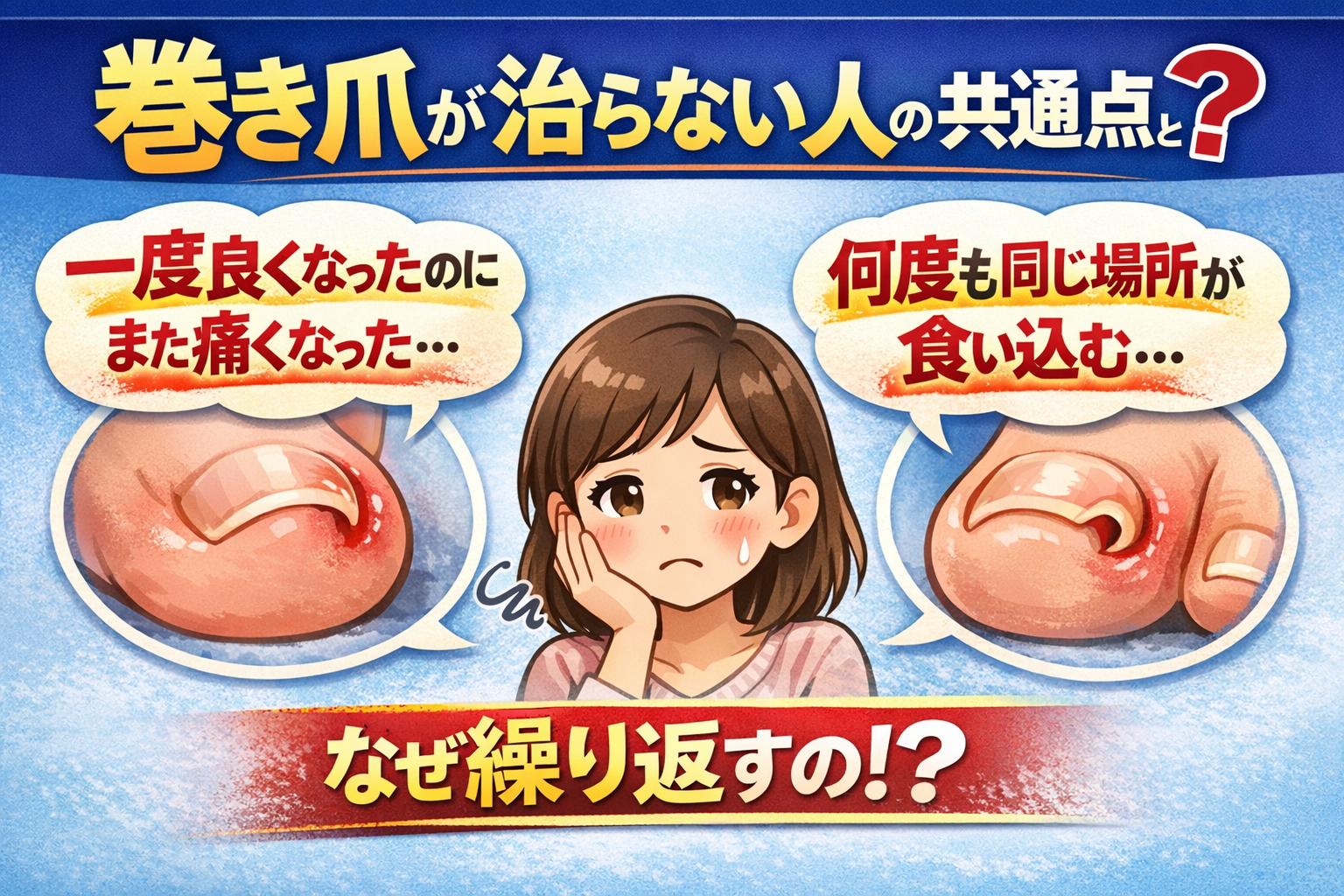 巻き爪がなかなか良くならない方へ。実はその原因、爪ではなく「普段の生活習慣」にあるかもしれません。知らずに続けている行動が、巻き爪を悪化させているケースは非常に多いです。本記事では、巻き爪が悪化する意外な原因と、今すぐ見直すべきポイントを分かりやすく解説します。藤枝周辺で巻き爪にお悩みの方は必見です。